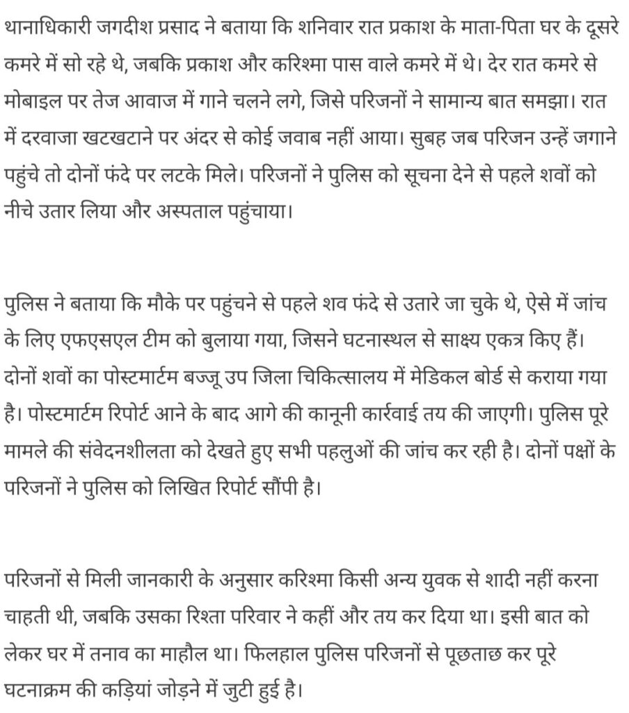 आत्महत्या की खबर बीकानेर के बज्जू थाना क्षेत्र से है जहां पर, लाइव इन रिलेशनशिप में रह रहे युवक युवती ने फांसी का फंदा लगाकर आत्महत्या कर ली, घटना शनिवार देर रात्रि की बताई जा रही है, पुलिस के अनुसार युवती की शादी कहीं और तय हो गई थी जिसके चलते उन पर मानसिक दबाव था, और इसी के चलते दोनों ने आत्महत्या कर ली, दोनों मृतकों की पहचान कर ली गई है ।यूवती की पहचान करिश्मा आयु उम्र 20 वर्ष वहीं युवक की पहचान प्रकाश आयु 21 वर्ष के रूप में हुई